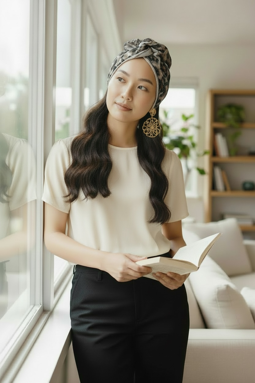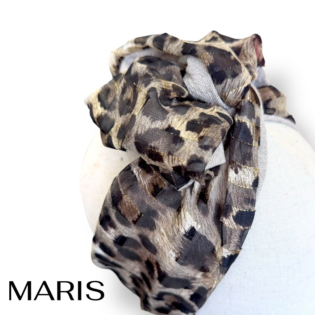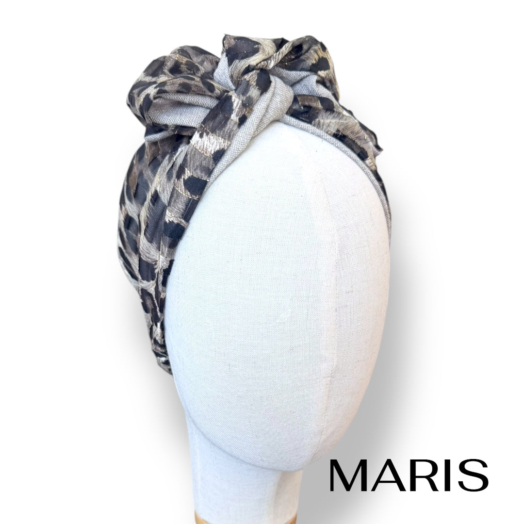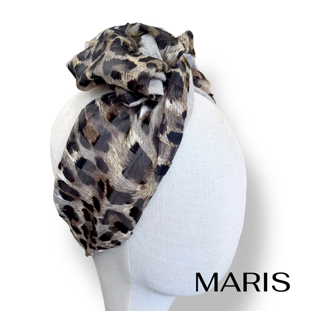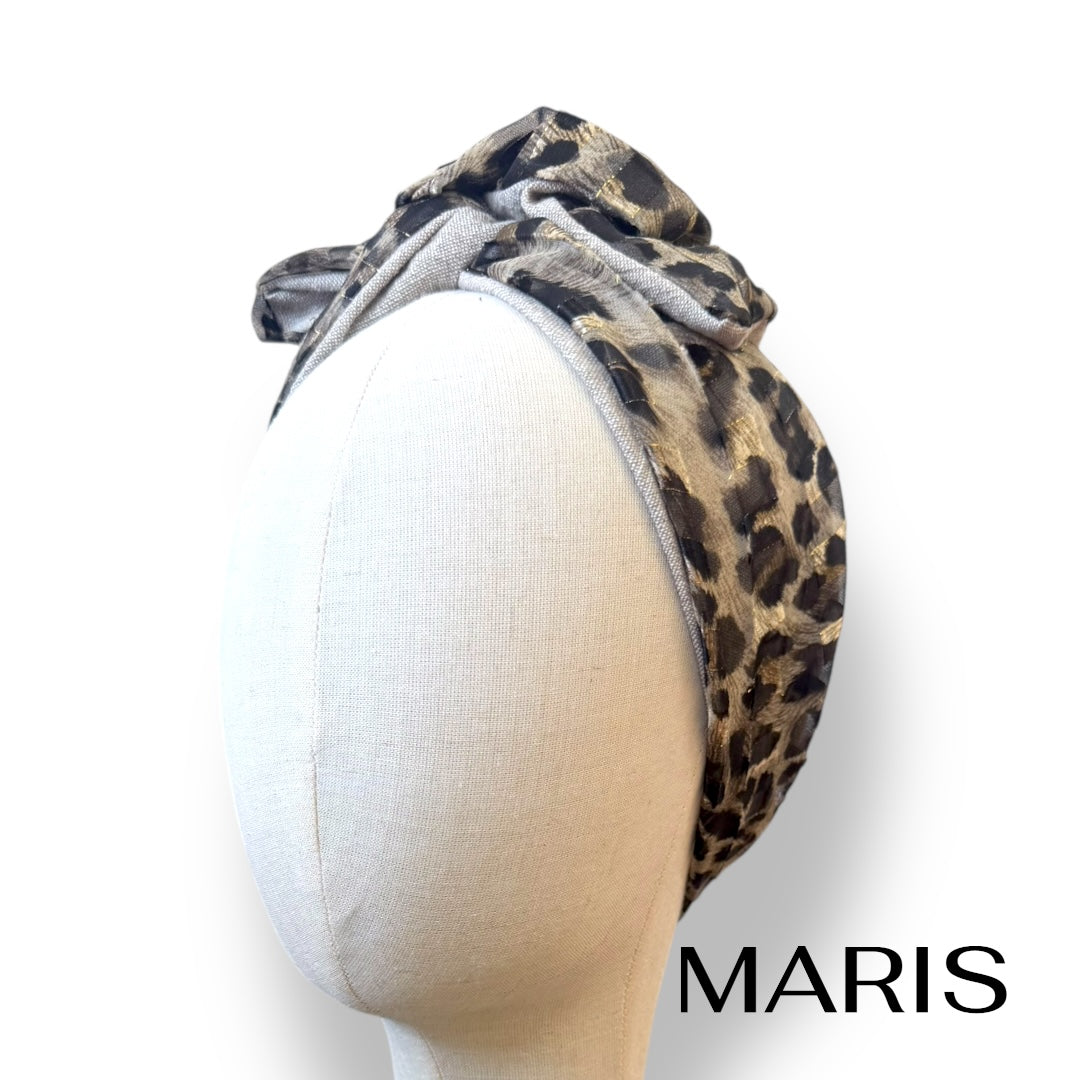 ゴールドのラインが入ったレオパード柄が印象的なターバン。
